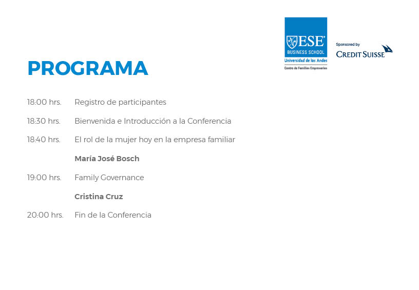 El martes 2 de abril se realizará la conferencia “Family Governance y el Rol de la Mujer en la Empresa Familiar”. El evento es organizado por el Centro Familas Empresarias del ESE Business School de la Universidad de los Andes y patrocinado por Credit Suisse.